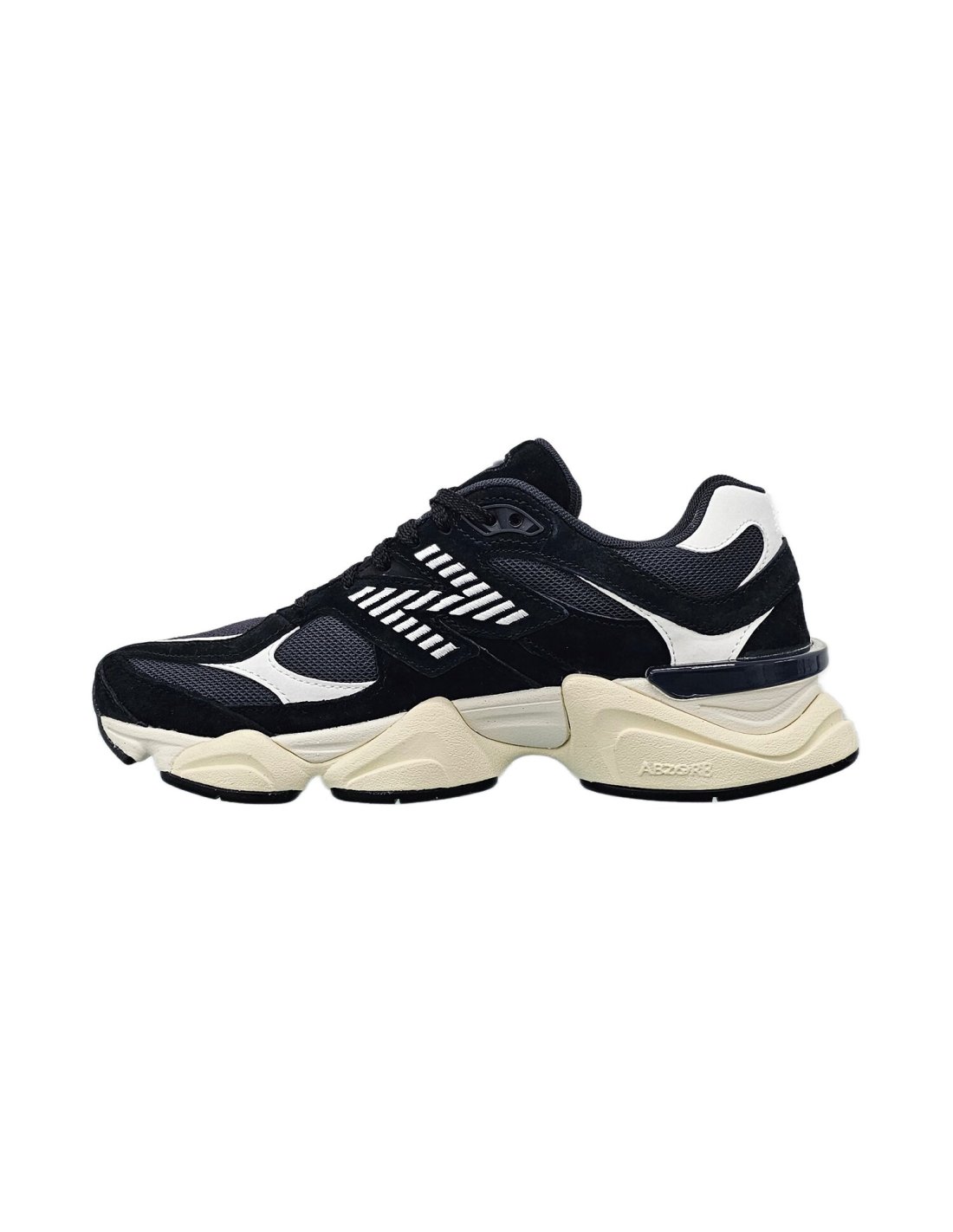 Le barre di oscillazione, riprese dalle 990, sono state ampliate e utilizzate su tutta la tomaia per conferire un senso di movimento visibile, mentre le linee ondulate e le proporzioni scalate sull'intersuola scolpita pongono un'enfasi esagerata sulle note piattaforme di ammortizzazione ABZORB e SBS.